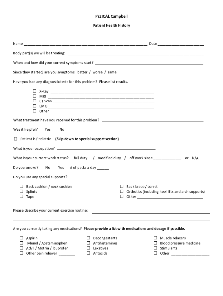 TYPICAL Campbell Patient Health HistoryName ___ Date ___ Body part(s) we will be treating: ___ When and how did your current symptoms start? Since they started, are you symptoms: better / worse /