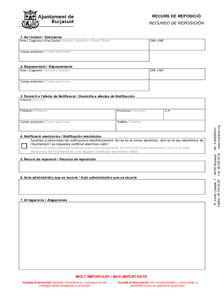 RECURS DE REPOSING RECURS ODE REPOSITION 1. Soliciting / SolicitanteNom i Pogroms o Ra Social / Hombre y Spellings o Ran Social o NIFCorreu electric / Core electrnico2. Represent ant / Represent ante