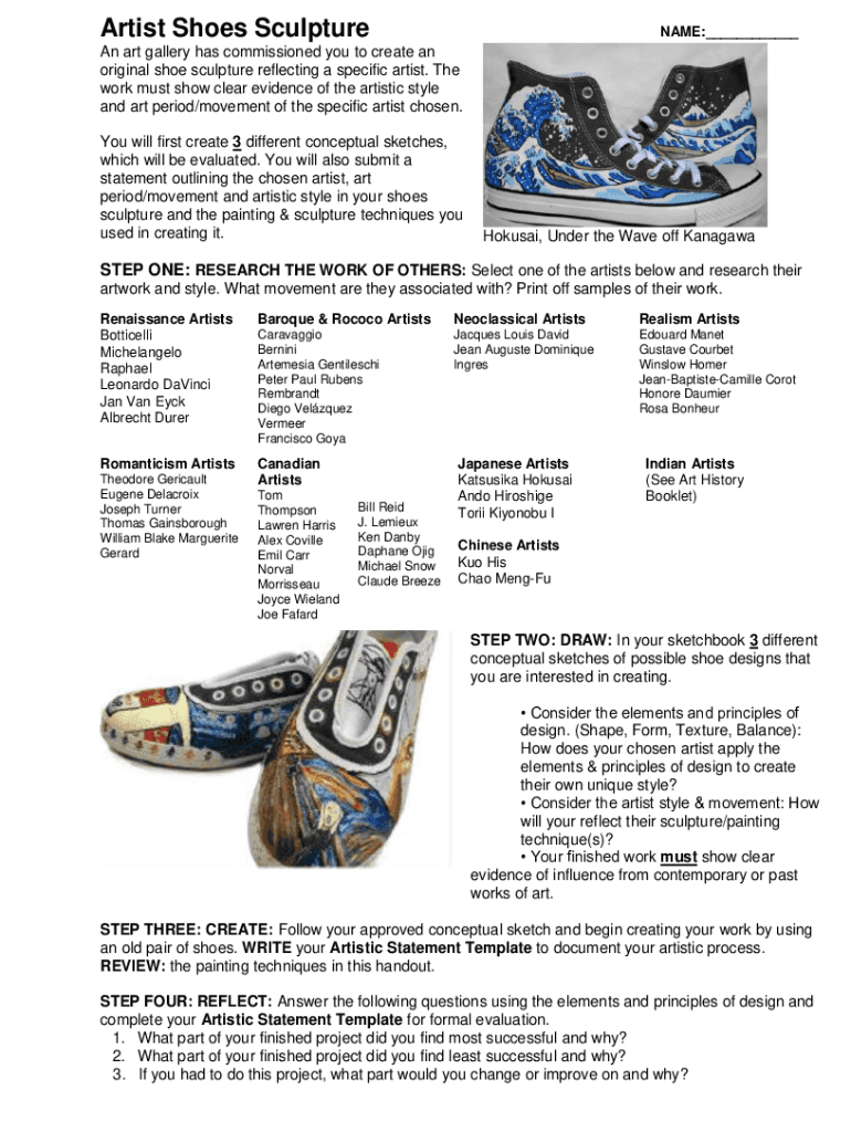 Artist Shoes SculptureNAME:___An art gallery has commissioned you to create an original shoe sculpture reflecting a specific artist. The work must show clear evidence of the artistic style and art