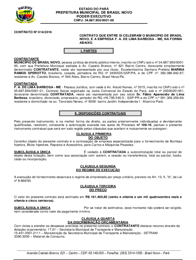 ESTATE DO PARPREFEITURA MUNICIPAL DE BRAZIL NOVA POWER EXECUTIVE CNJ: 34.887.950/000100CONTRATO N 014/2016 CONTRALTO QUE ENTIRE SI CELEB RAM O MUNICIPAL DE BRAZIL NOVA, E A EMPRESS F. A. DE LIMA BARBOSA