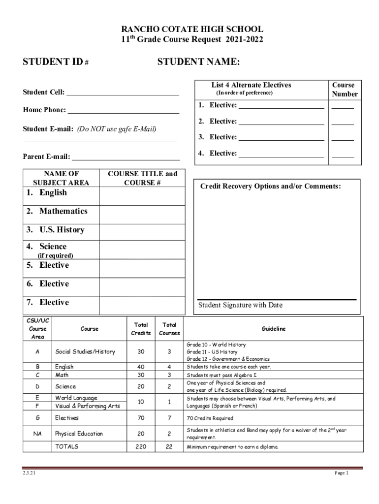 RANCHO ROTATE HIGH SCHOOL 11th Grade Course Request 20212022STUDENT ID #STUDENT NAME: List 4 Alternate ElectivesStudent Cell:1. Elective: ___Course Number ___2. Elective: ______3. Elective: ______4.