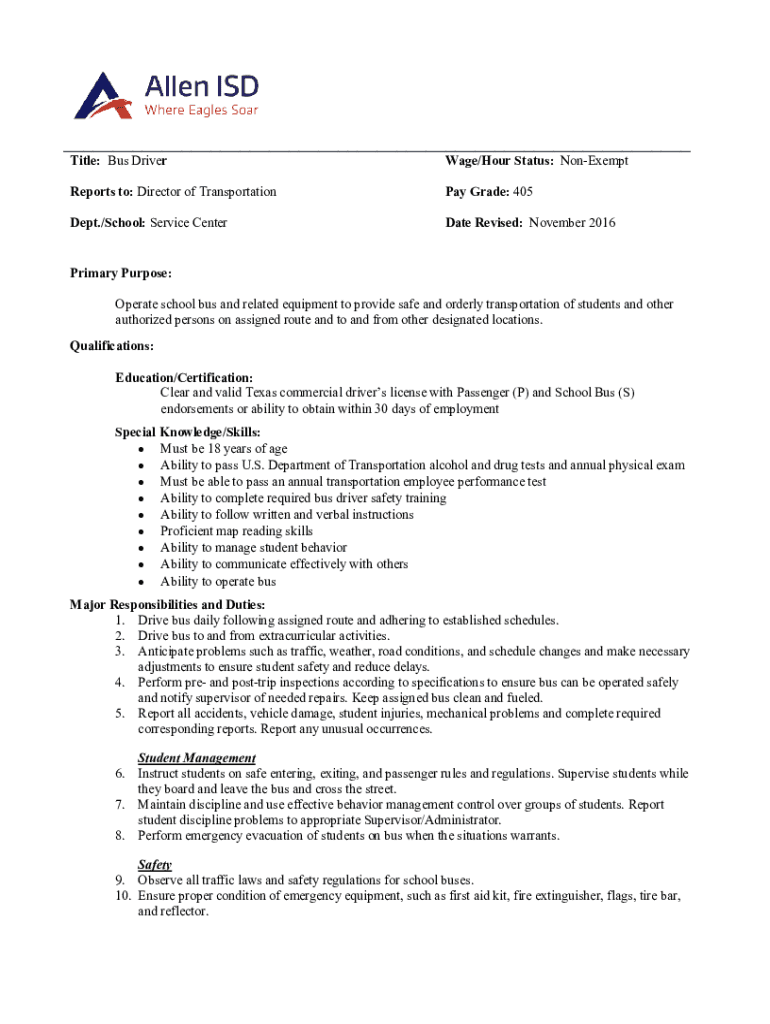 ___ Title: Bus Diverge/Hour Status: NonExemptReports to: Director of Transportation Grade: 405Dept./School: Service Generate Revised: November 2016Primary Purpose: Operate school bus and related equipment
