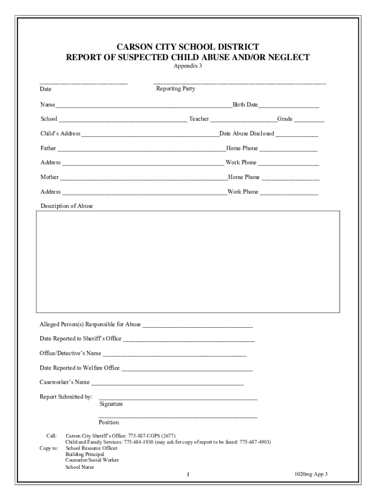 CARSON CITY SCHOOL DISTRICT REPORT OF SUSPECTED CHILD ABUSE AND/OR NEGLECT Appendix 3___ Date___ Reporting PartyName___Birth Date___ School ___ Teacher ___Grade ___ Child's Address ___Date Abuse Disclosed