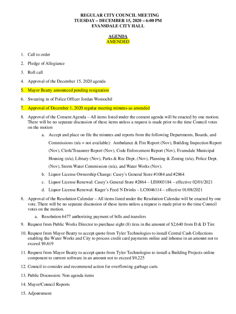 REGULAR CITY COUNCIL MEETING TUESDAY, DECEMBER 15, 2020 6:00 PM EVANSVILLE CITY HALL AGENDA AMENDED 1. Call to order 2. Pledge of Allegiance 3. Roll call 4. Approval of the December 15, 2020, agenda