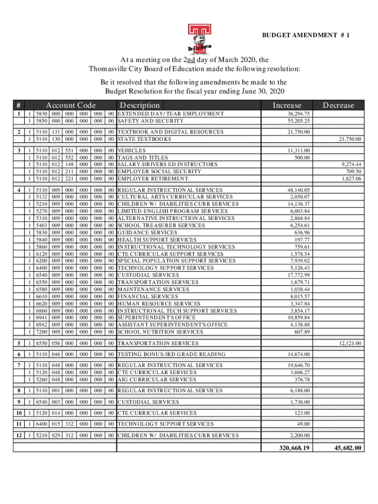 BUDGET AMENDMENT # 1At a meeting on the 2nd day of March 2020, the Thomasville City Board of Education made the following resolution: Be it resolved that the following amendments be made to the Budget