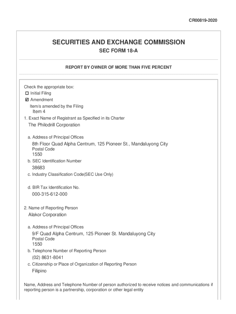 CR008192020SECURITIES AND EXCHANGE COMMISSION SEC FORM 18A REPORT BY OWNER OF MORE THAN FIVE PERCENTCheck the appropriate box: Initial Filing Amendment Item/s amended by the FilingItem 4 1. Exact