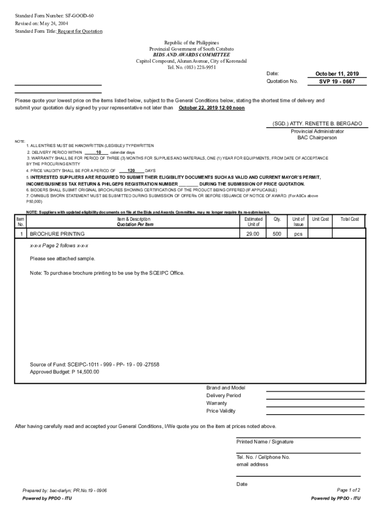 Standard Form Number: SFGOOD60 Revised on: May 24, 2004, Standard Form Title: Request for Quotation Republic of the Philippines Provincial Government of South Combat BIDS AND AWARDS COMMITTEE Capitol