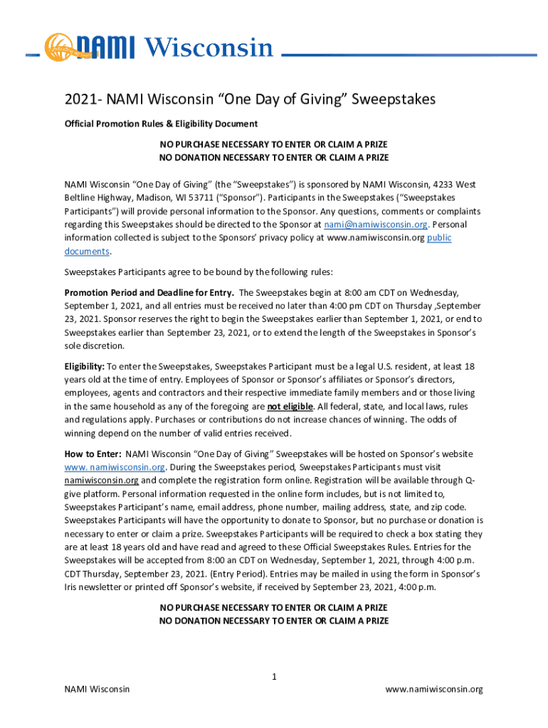 2021 NAME Wisconsin One Day of Giving Sweepstakes Official Promotion Rules & Eligibility Document NO PURCHASE NECESSARY TO ENTER OR CLAIM A PRIZE NO DONATION NECESSARY TO ENTER OR CLAIM A PRIZE NAME