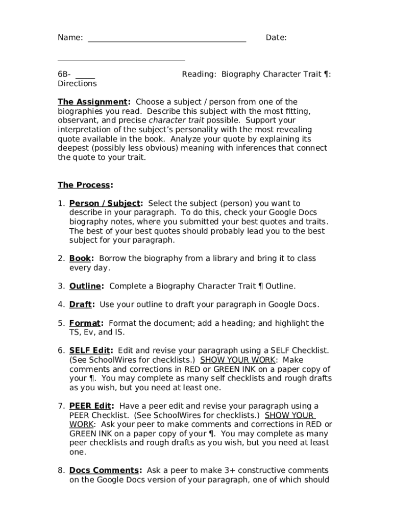 Name: Date: 6B-Reading: Biography Character Trait template instructions
