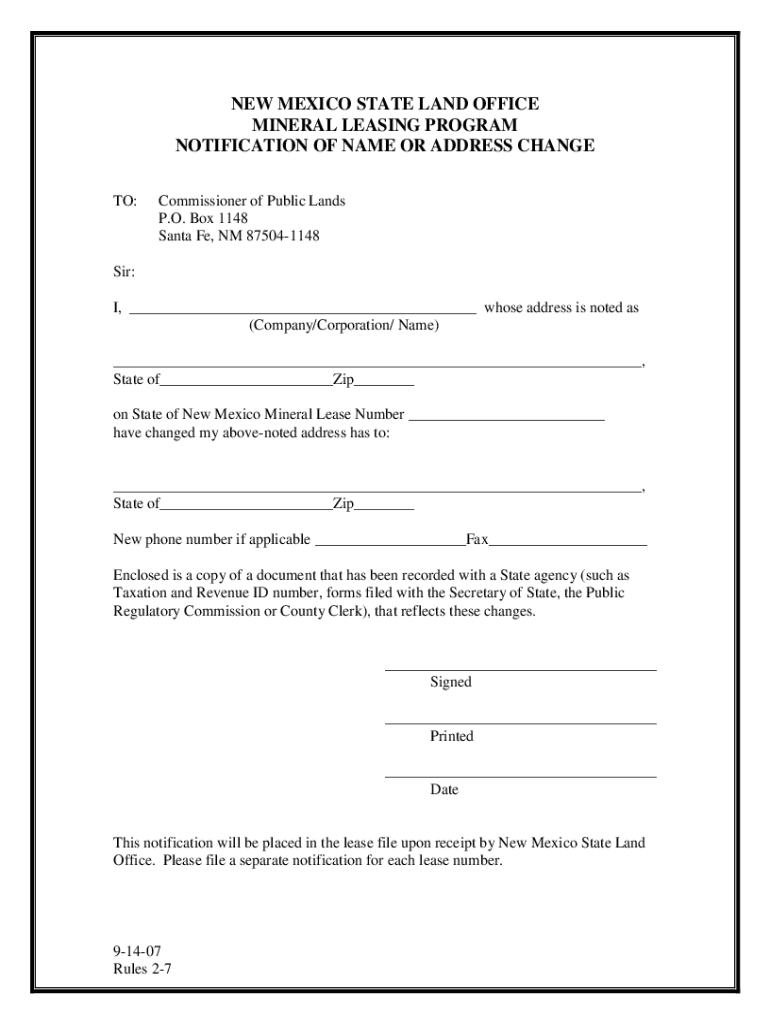 NEW MEXICO STATE LAND OFFICE MINERAL LEASING PROGRAM NOTIFICATION OF NAME OR ADDRESS CHANGE TO:Commissioner of Public Lands P.O. Box 1148 Santa Fe, NM 875041148Sir: I, ___ whose address is noted as