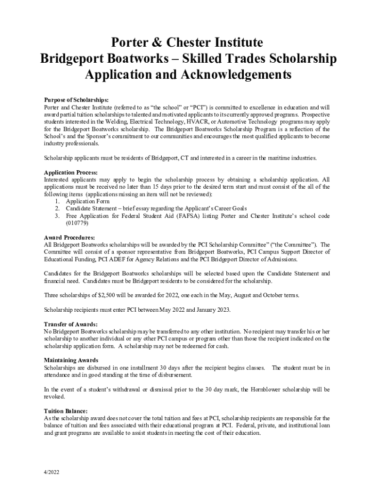 Porter & Chester Institute Bridgeport Boat works Skilled Trades Scholarship Application and Acknowledgements Purpose of Scholarships: Porter and Chester Institute (referred to as the school or PCI)