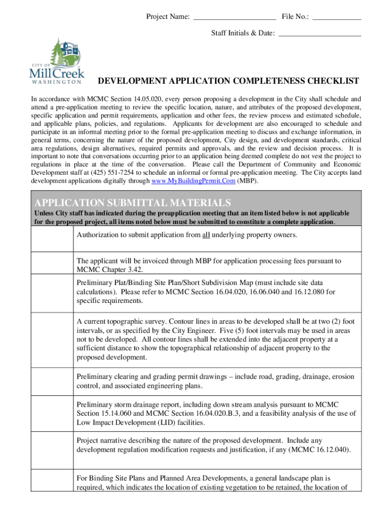 Project Name: ___ File No.: ___ Staff Initials & Date: ___DEVELOPMENT APPLICATION COMPLETENESS CHECKLIST In accordance with CMC Section 14.05.020, every person proposing a development in the City