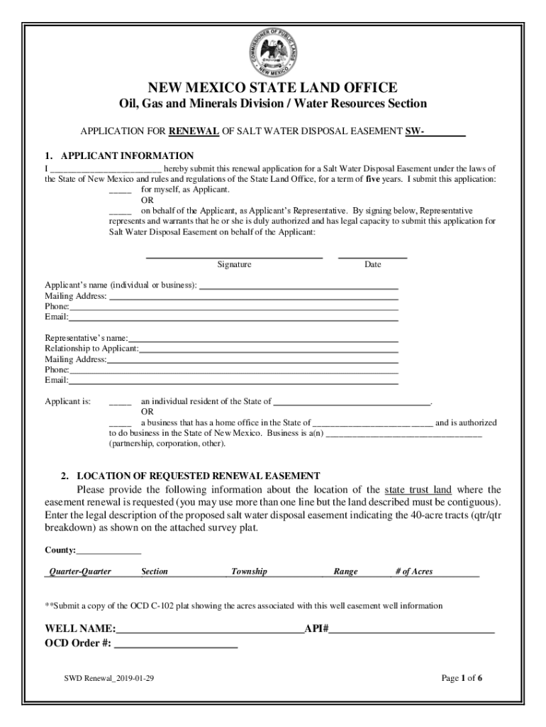 NEW MEXICO STATE LAND OFFICE Oil, Gas and Minerals Division / Water Resources Section APPLICATION FOR RENEWAL OF SALT WATER DISPOSAL EASEMENT SW1. APPLICANT INFORMATION I ___ hereby submit this renewal