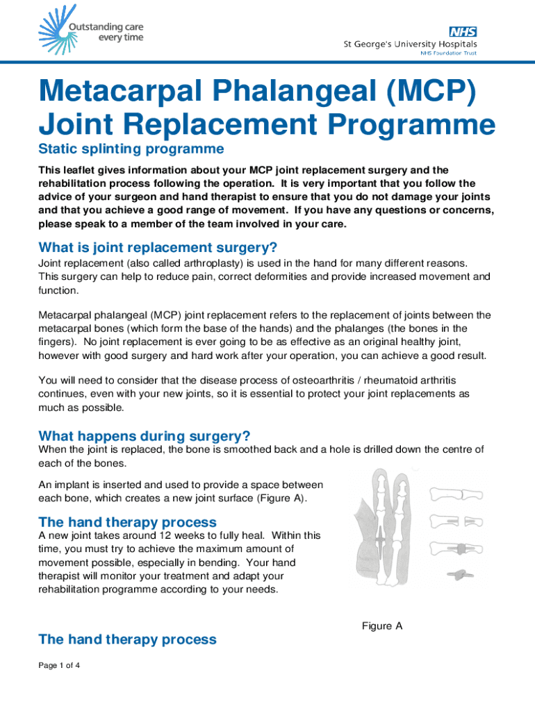 Metacarpal Phalanges (MCP) Joint Replacement Program Static splinting program This leaflet gives information about your MCP joint replacement surgery and the rehabilitation process following the operation.