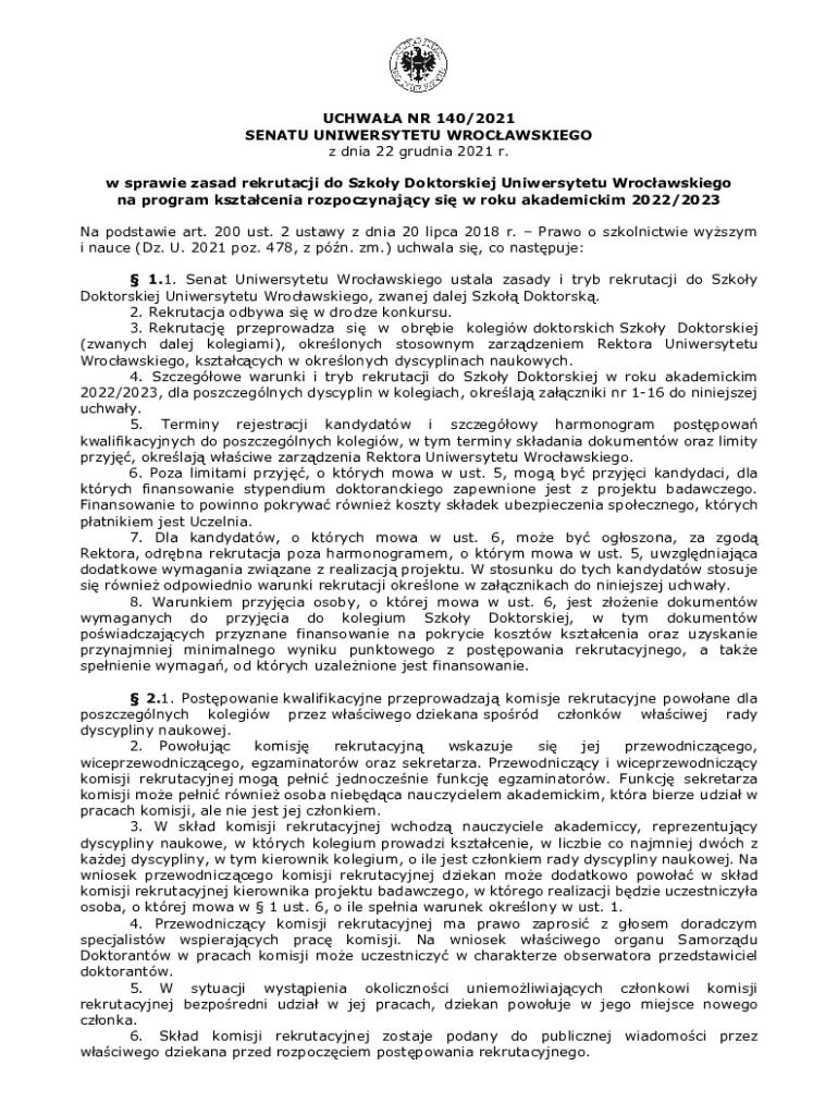 SCHWA NR 140/2021 SENATE UNIWERSYTETU WROCAWSKIEGO z Dina 22 Russia 2021 r. w sprawl based rekrutacji do Sky Doktorskiej Uniwersytetu Wrocawskiego Na program ksztacenia rozpoczynajcy is w Roku akademickim