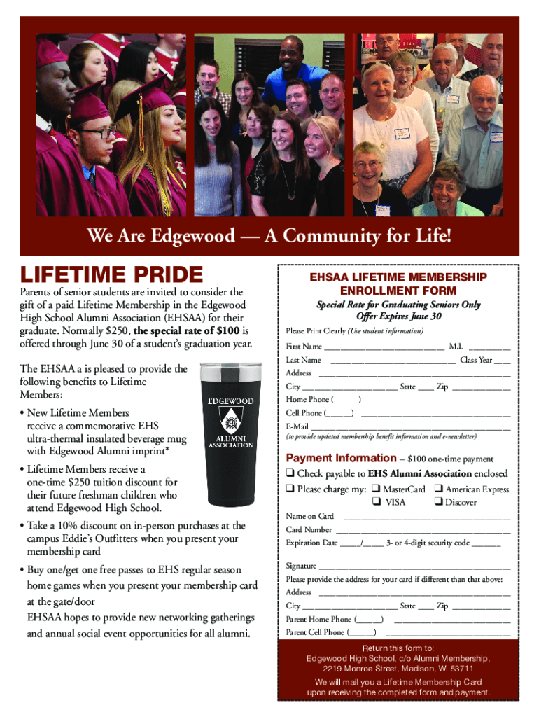 We Are Edgewood A Community for Life!LIFETIME PRIDE Parents of senior students are invited to consider the gift of a paid Lifetime Membership in the Edgewood High School Alumni Association (ESAA)