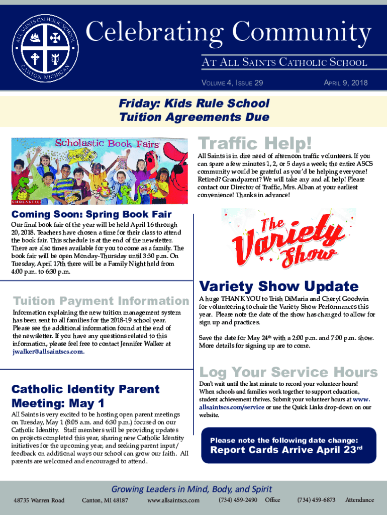 Celebrating Community At All Saints Catholic School April 9, 2018Volume 4, Issue 29Friday: Kids Rule School Tuition Agreements Traffic Help! All Saints are in dire need of afternoon traffic volunteers.