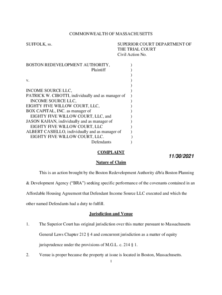 COMMONWEALTH OF MASSACHUSETTS SUFFOLK, SS. SUPERIOR COURT DEPARTMENT OF THE TRIAL COURT Civil Action No. BOSTON REDEVELOPMENT AUTHORITY, Plaintiff v. INCOME SOURCE LLC, PATRICK W. ABBOTT, individually
