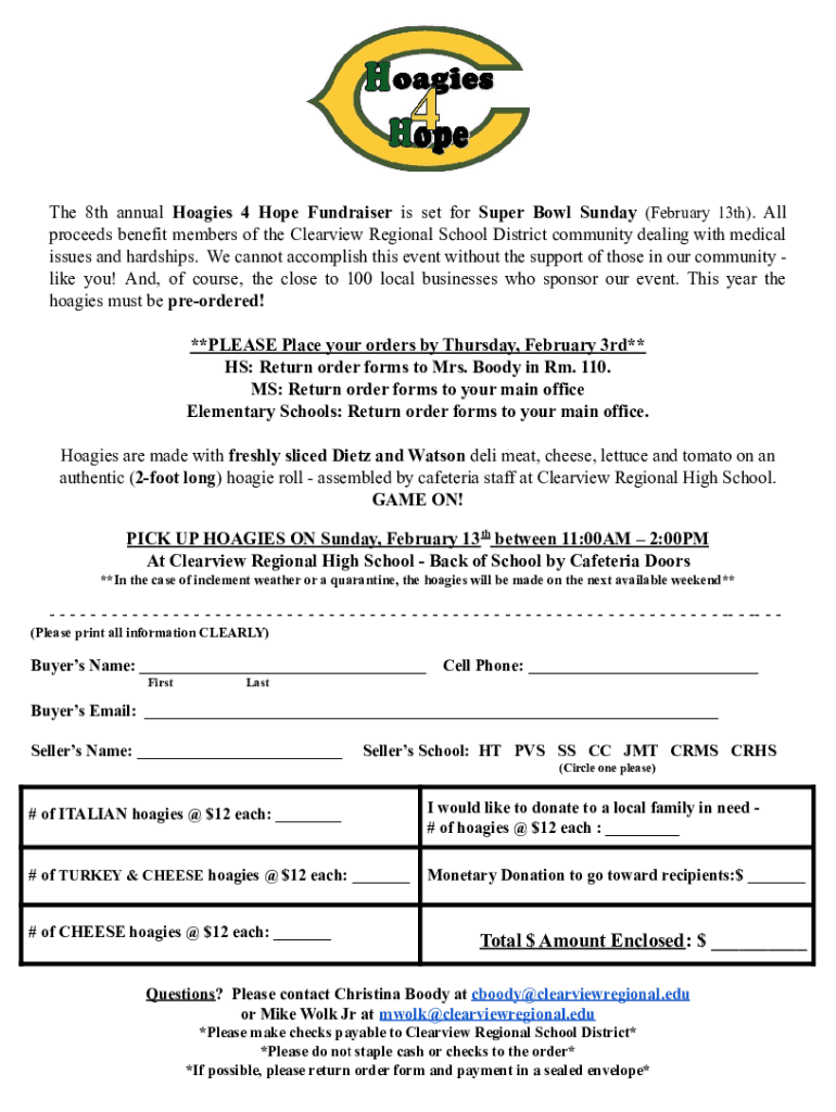 The 8th annual Hoagies 4 Hope Fundraiser is set for Super Bowl Sunday (February 13th). All proceeds benefit members of the Clearview Regional School District community dealing with medical issues
