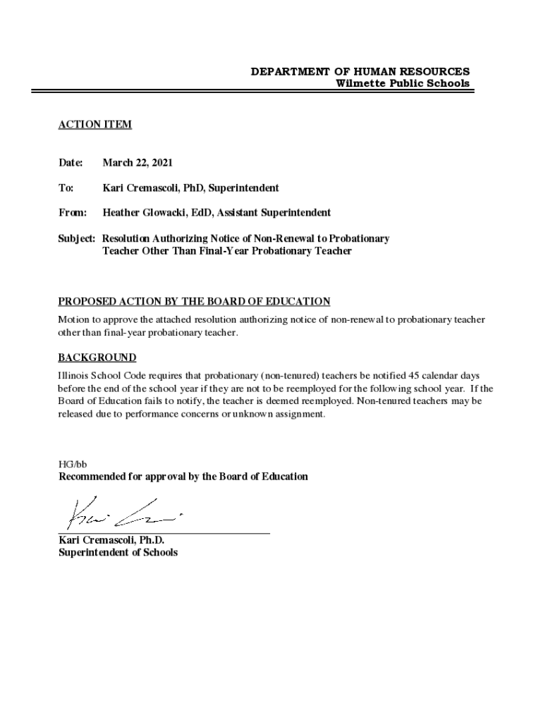 Date:March 22, 2021To:Kari Cremascoli, PhD, SuperintendentFrom:Heather Glock, EDD, Assistant SuperintendentSubject: Resolution Authorizing