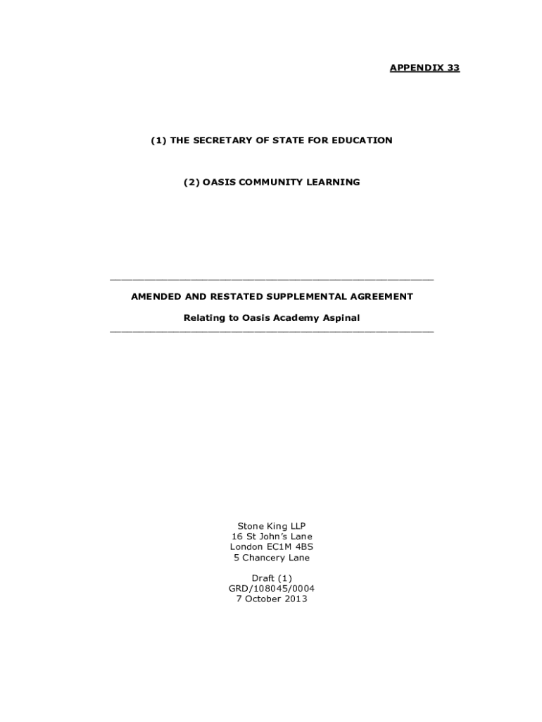 APPENDIX 33(1) THE SECRETARY OF STATE FOR EDUCATION(2) OASIS COMMUNITY LEARNING___ AMENDED AND RESTATED SUPPLEMENTAL AGREEMENT Relating to Oasis Academy Spinal ___Stone King LLP 16 St Johns Lane London