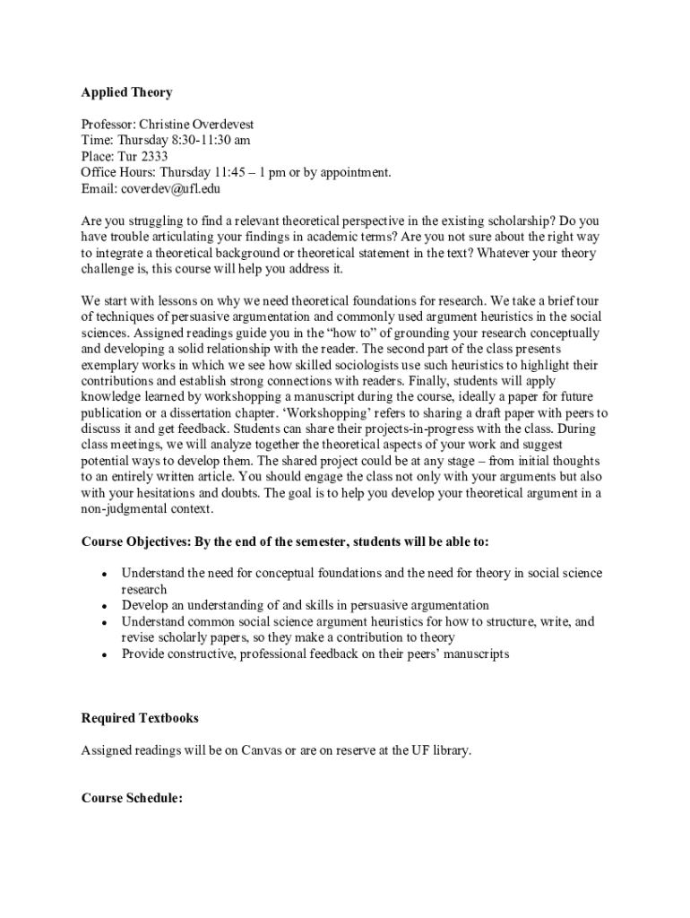 Applied Theory Professor: Christine Overinvest Time: Thursday 8:3011:30 am Place: Our 2333 Office Hours: Thursday 11:45 1 pm or by appointment. Email: coverdev@ufl.edu Are you struggling to find a