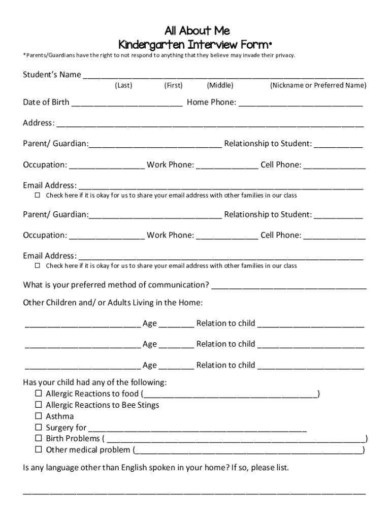All About Me Kindergarten Interview Form**Parents/Guardians have the right to not respond to anything that they believe may invade their privacy. Students Name ___(Last)(First)(Middle)(Nickname or