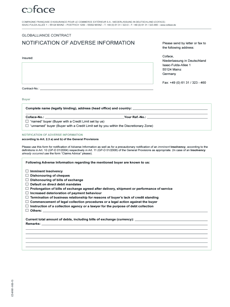 Get the free NotiFiCation oF aDVerse inFormation notiFiCation oF bb - Coface