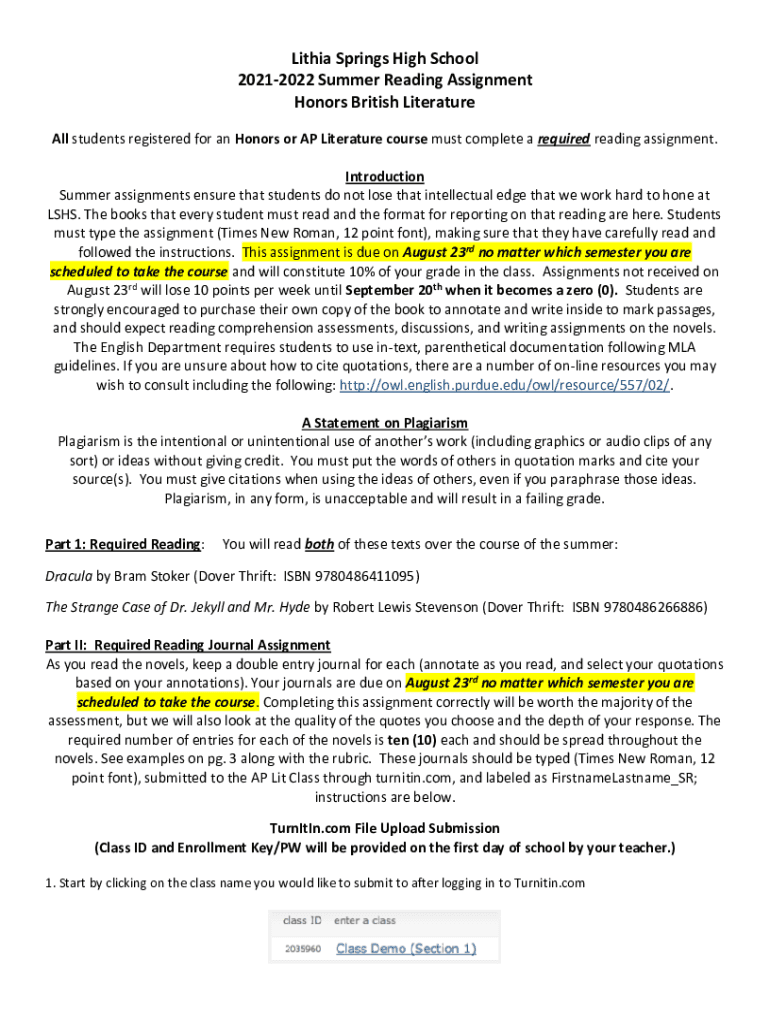 Lithia Springs High School 20212022 Summer Reading Assignment Honors British Literature All students registered for an Honors or AP Literature course must complete a required reading assignment. Introduction