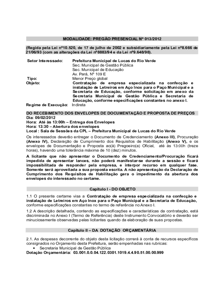 (Regina plea Lei n10.520, DE 17 de Julio de 2002 e subsidiariamente plea Lei n8.666 DE