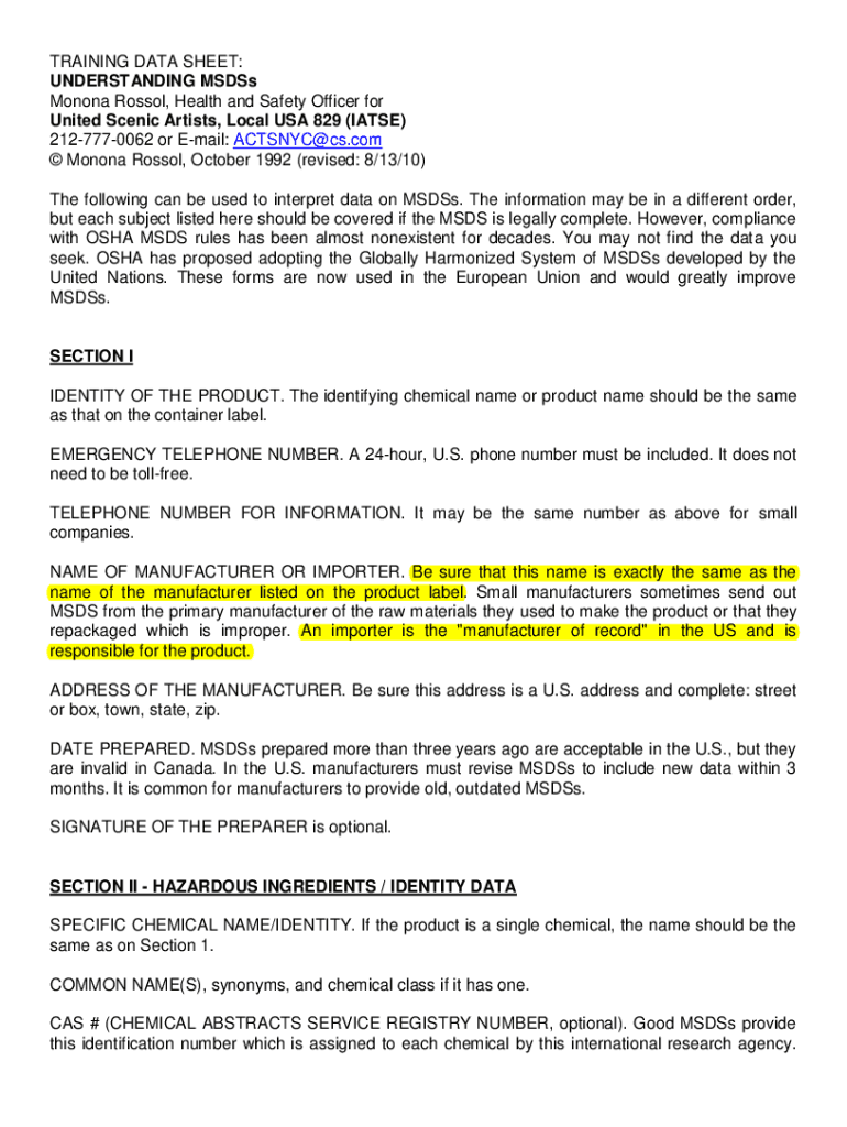 TRAINING DATA SHEET: UNDERSTANDING MSDS Moon Ross, Health and Safety Officer for United Scenic Artists, Local USA 829 (IA TSE) 2127770062 or Email: ACTSNYC@cs.com Moon Ross, October 1992 (revised: