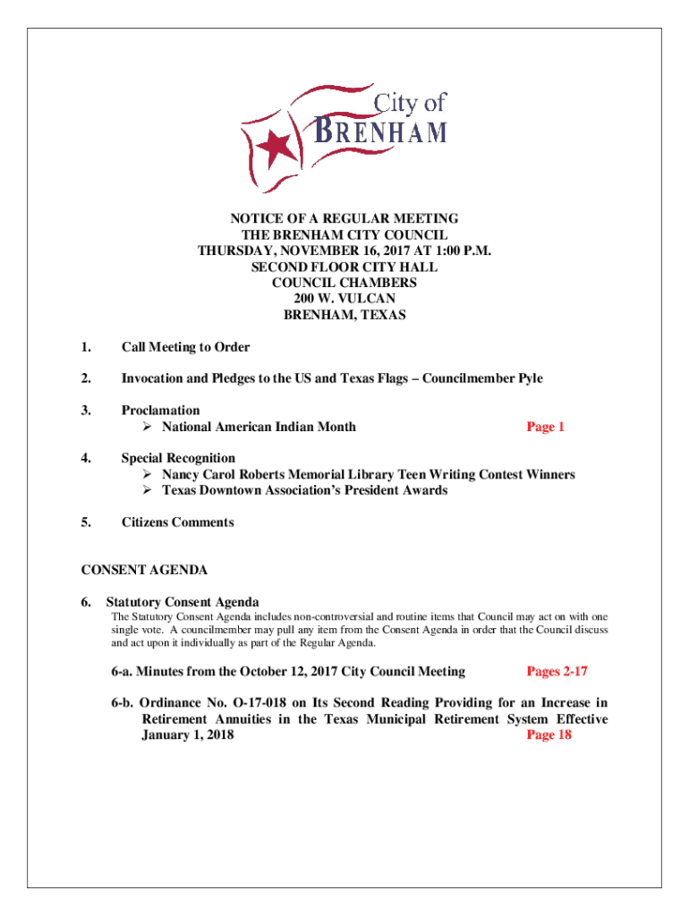 NOTICE OF A REGULAR MEETING THE BRENDAN CITY COUNCIL THURSDAY, NOVEMBER 16, 2017, AT 1:00 P.M. SECOND FLOOR CITY HALL COUNCIL CHAMBERS 200 W. VULCAN BRENDAN, TEXAS 1. Call Meeting to Order2. Invocation