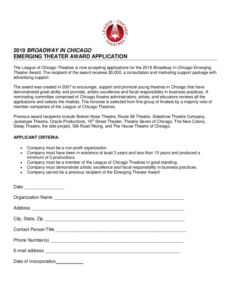 2019 BROADWAY IN CHICAGO EMERGING THEATER AWARD APPLICATION The League of Chicago Theaters is now accepting applications for the 2019 Broadway In Chicago Emerging Theater Award. The recipient of the