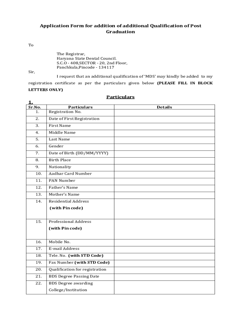 Application Form for addition of additional Qualification of Post Graduation Tithe Registrar, Haryana State Dental Council. S.C.O 408,SECTOR 20, 2nd Floor, Patchouli, Pin code 134117Sir,I request