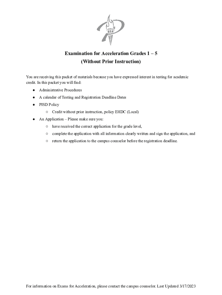Examination for Acceleration Grades 1 5 (Without Prior Instruction) You are receiving this packet of materials because you have expressed interest in testing for academic credit. In this packet you