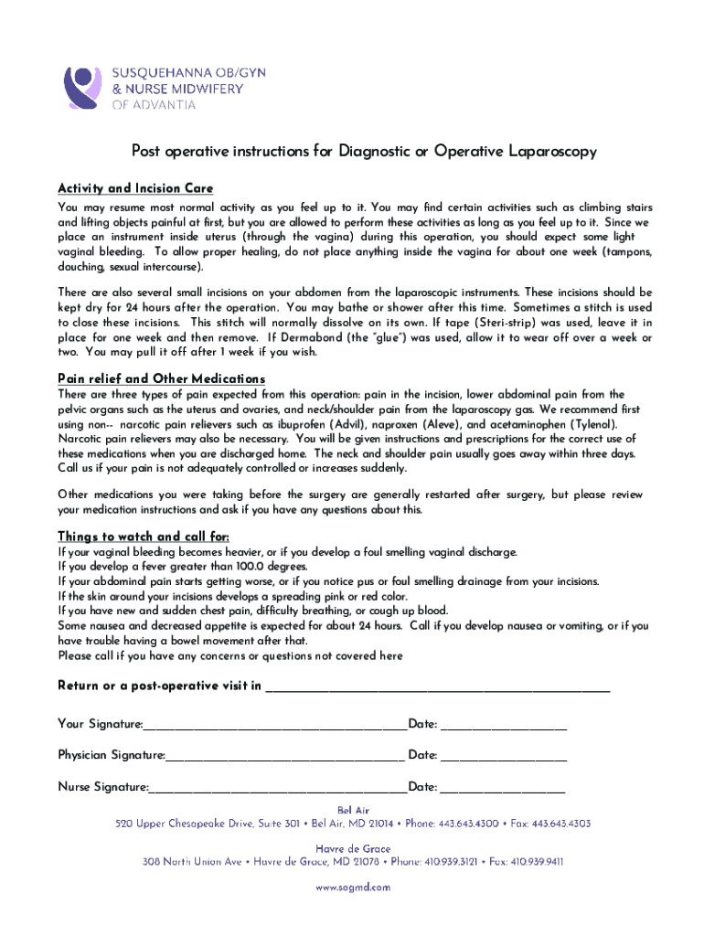 Post-operative instructions for Diagnostic or Operative Laparoscopy Activity and Incision Care You may resume most normal activity as you feel up to it. You may find certain activities such as climbing