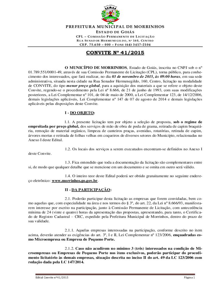 CPL COMICS PERMANENTEDELICITAORUA SENATOR HERMENEGILDO, N 160, CENTRIC. 75.650 000 ONE (64) 34172104CONVITE N 41/2015