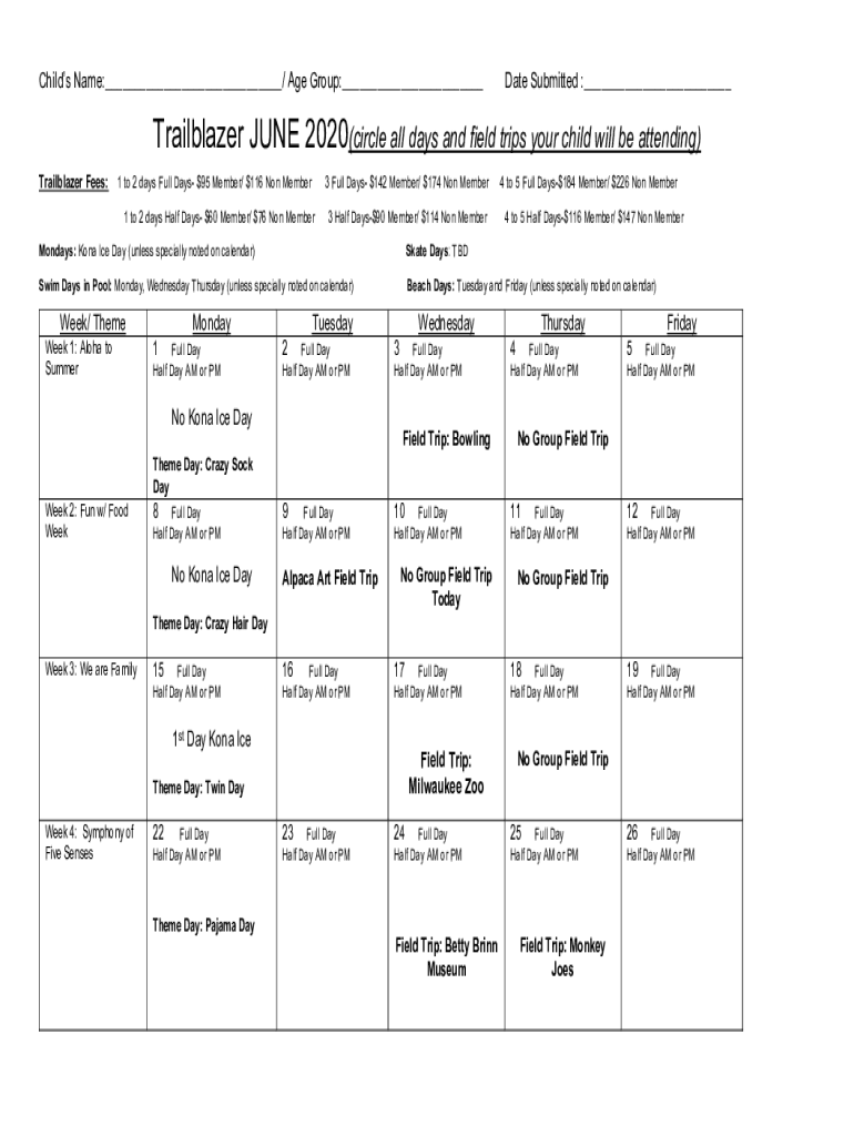 Child's Name:___/ Age Group:___Date Submitted :___Trailblazer JUNE 2020(circle all days and field trips your child will be attending) Trailblazer Fees: 1 to 2 days Full Days $95 Member/ $116 Non Member3