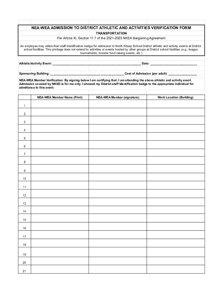 NEWER ADMISSION TO DISTRICT ATHLETIC AND ACTIVITIES VERIFICATION FORM TRANSPORTATION Per Article XI, Section 11.7 of the 20212023 NEA Bargaining Agreement An employee may utilize their staff identification