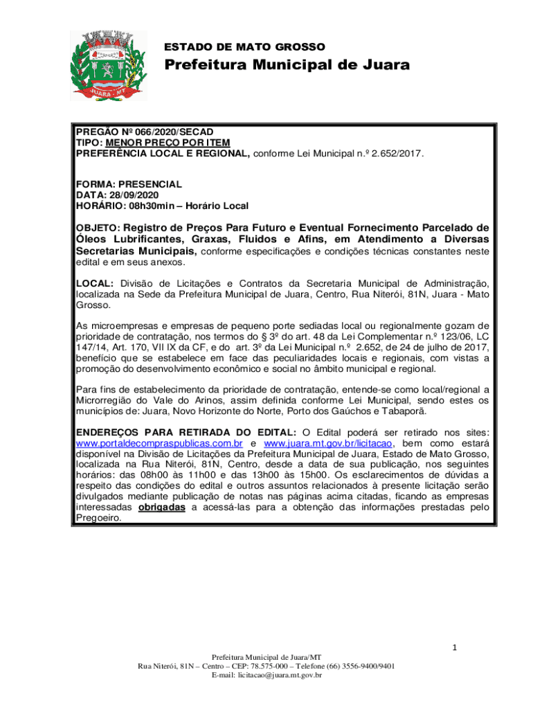 ESTATE DE NATO GROSSOPrefeitura Municipal de JuaraPREGO N 066/2020/SECAM