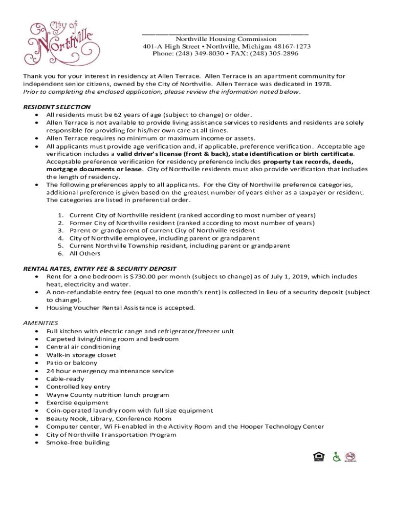 ___ Northville Housing Commission 401A High Street Northville, Michigan 481671273 Phone: (248) 3498030 FAX: (248) 3052896Thank you for your interest in residency at Allen Terrace. Allen Terrace is