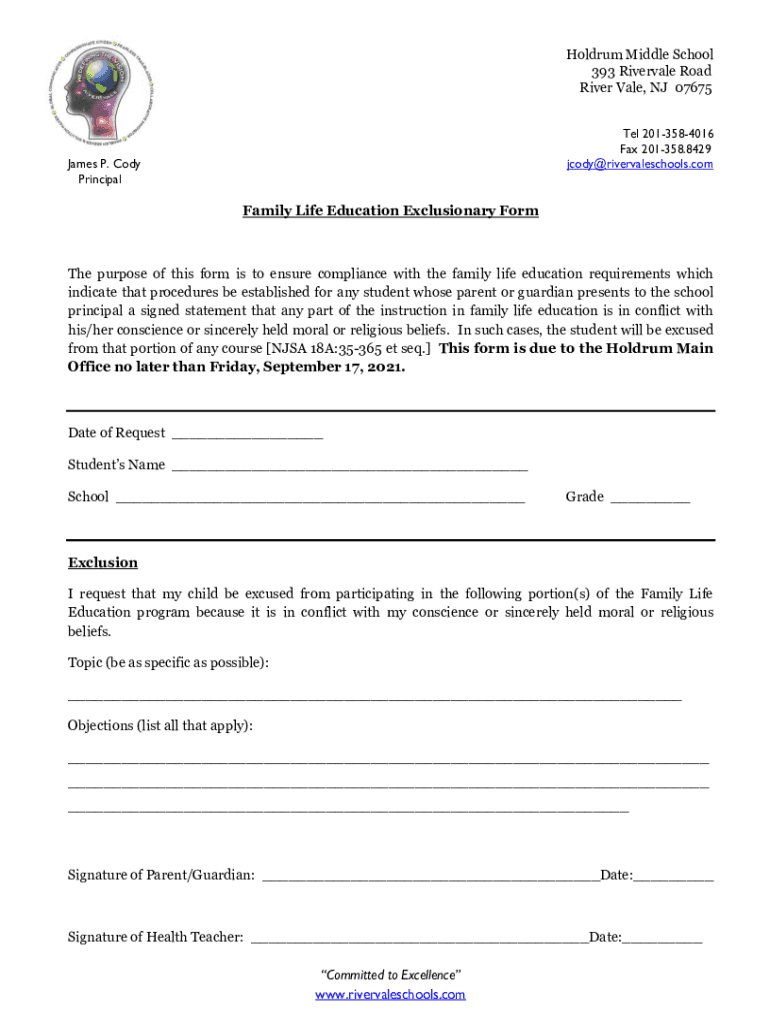 Hold rum Middle School 393 River vale Road River Vale, NJ 07675 Tel 2013584016 Fax 201358.8429 jcody@rivervaleschools.comJames P. Cody PrincipalFamily Life Education Exclusionary Forth purpose of