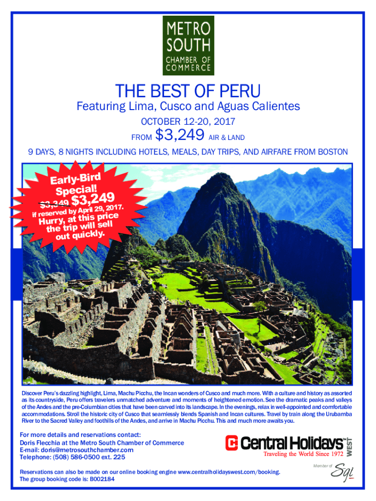 THE BEST OF PERUFeaturing Lima, Cusco and Aquas Clients OCTOBER 1220, 2017FROM$3,249 AIR & LAND9 DAYS, 8 NIGHTS INCLUDING HOTELS, MEALS, DAY TRIPS, AND AIRFARE FROM BOSTONEarlyBird Special!,249017.