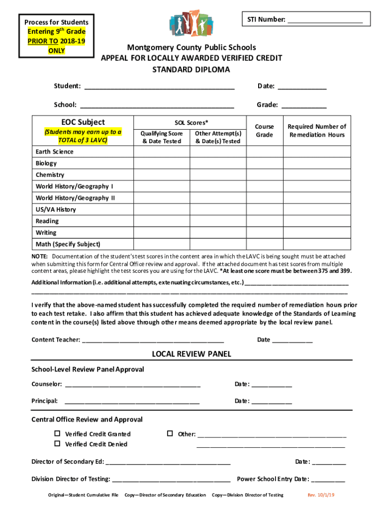 Process for Students Entering 9th Grade PRIOR TO 201819 ONLY STI Number: ___Montgomery County Public Schools APPEAL FOR LOCALLY AWARDED VERIFIED CREDIT STANDARD DIPLOMAStudent: ___Date: ___School: