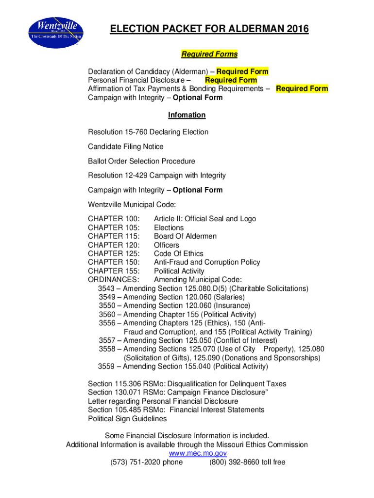 ELECTION PACKET FOR ALDERMAN 2016 Required Forms Declaration of Candidacy (Alderman) Required Form Personal Financial Disclosure Required Form Affirmation of Tax Payments & Bonding Requirements Required