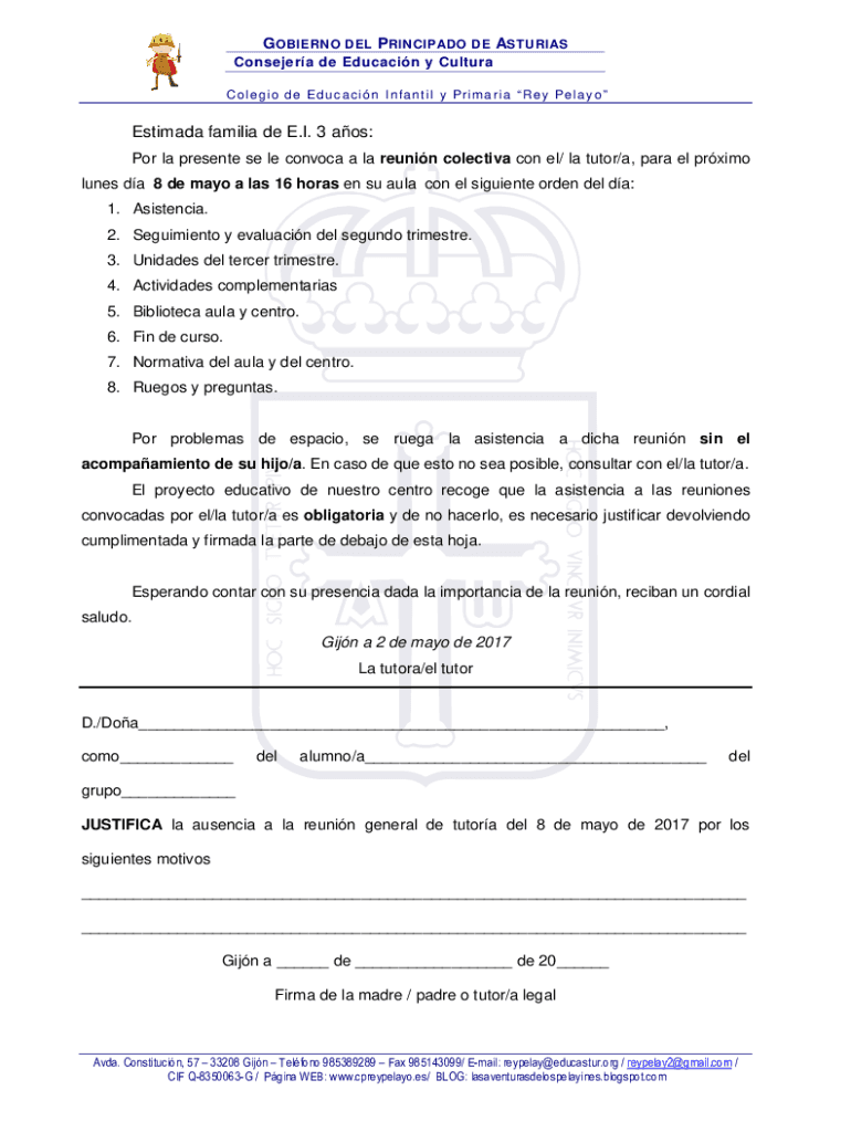 G OBSERVE DEL P PRINCIPAL DE ASTURIAS Consider de Education y Cultural Colegio de Educacin Infantile y Prim aria Rey PelayoEstimada familiar de E.I. 3 AOS: POR la present SE LE convoy à la reunion