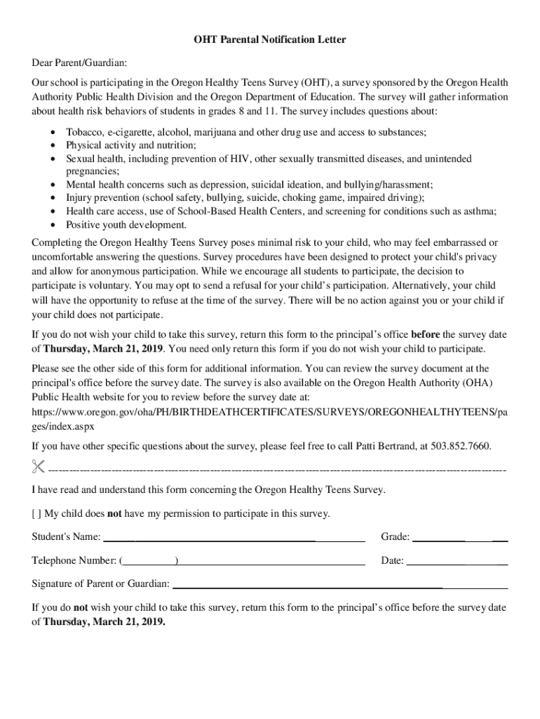 OUT Parental Notification Letter Dear Parent/Guardian: Our school is participating in the Oregon Healthy Teens Survey (OUT), a survey sponsored by the Oregon Health Authority Public Health Division