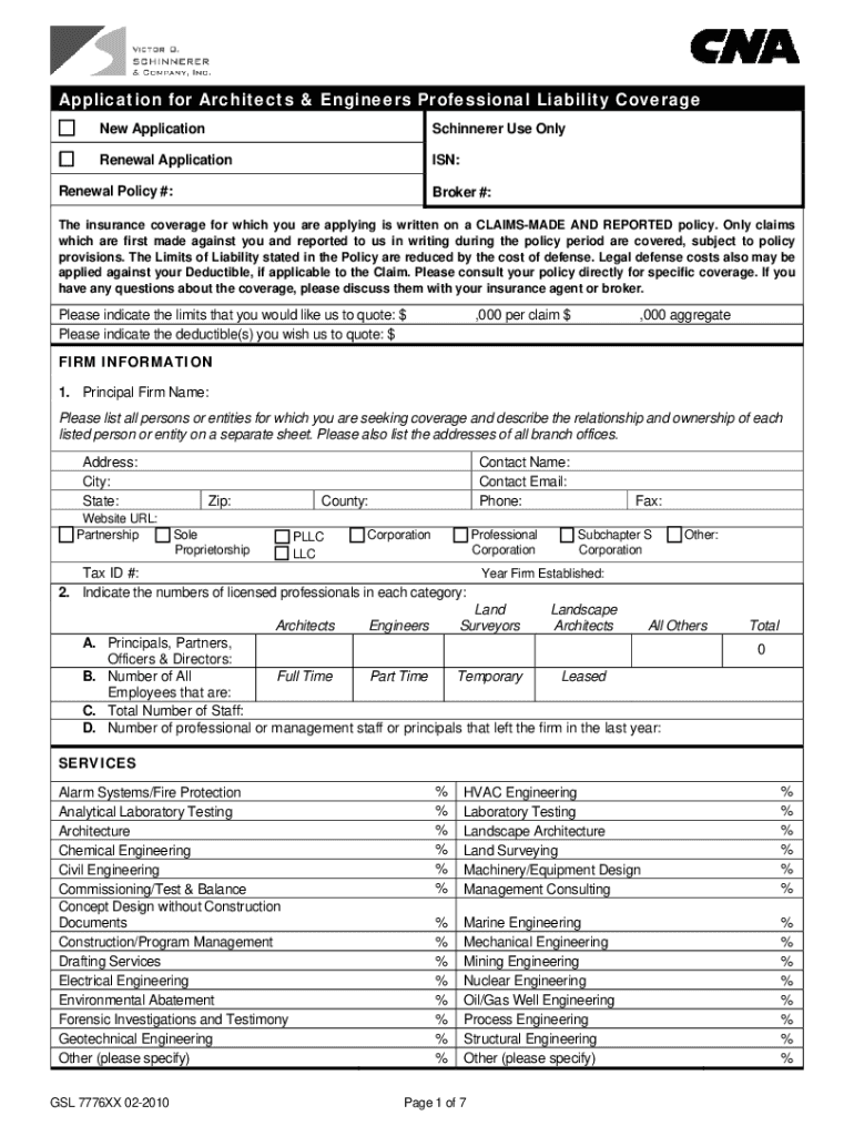 Application for Architects & Engineers Professional Liability Coverage New ApplicationSchinnerer Use OnlyRenewal Application ISN:Renewal Policy #:Broker #:The insurance coverage for which you are