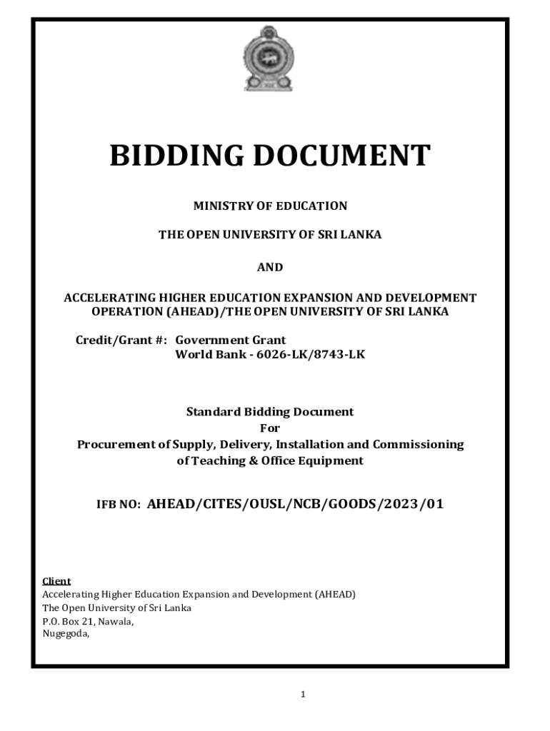 BIDDING DOCUMENT MINISTRY OF EDUCATION THE OPEN UNIVERSITY OF SRI LANKA AND ACCELERATING HIGHER EDUCATION EXPANSION AND DEVELOPMENT OPERATION (AHEAD)/THE OPEN UNIVERSITY OF SRI LANKA Credit/Grant