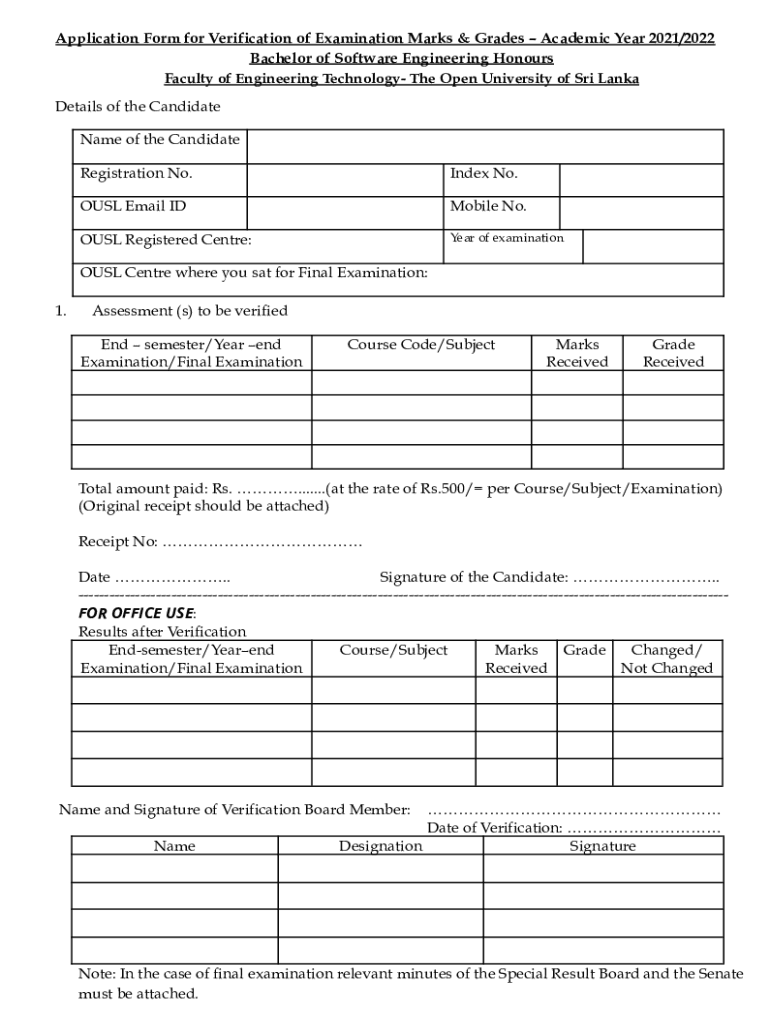 Application Form for Verification of Examination Marks & Grades Academic Year 2021/2022 Bachelor of Software Engineering Honors Faculty of Engineering Technology The Open University of Sri Lanka Details
